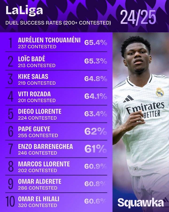 直播吧6月30日讯 Squawka统计表明,琼阿梅尼是2024-25赛季西甲对抗200+次的球员里,对抗成功率最高的球员。