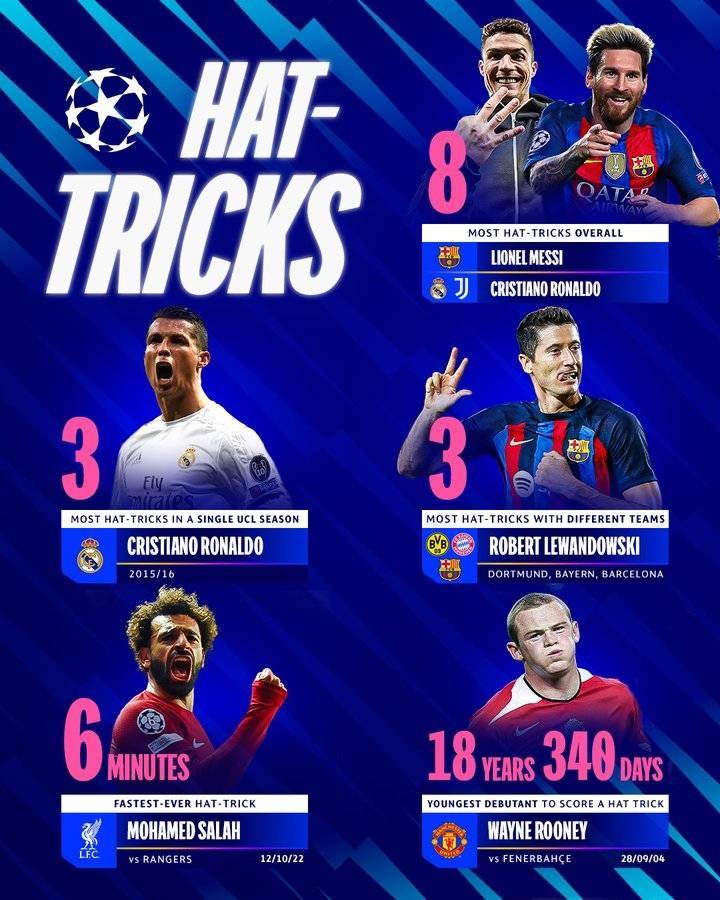直播吧07月11日讯 欧冠官方发布了欧冠历史上上演帽子戏法的各项纪录。